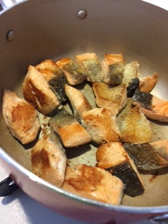 深鍋に油を薄くひいて鮭を入れ焼きます。