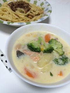 見た目普通にシチューですけど、鮭のだし?がかなり出てました。シチューだと鶏肉とか使いますけどこれはこれで好きかも…!
