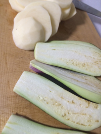 グラタン皿に揚げナスとジャガイモを重ねていき(ここからもっと乗せています)、