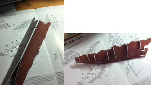 さて、船体ベースに船底をぐるっと包むように部品をつけて、船首、甲板がつきました。
